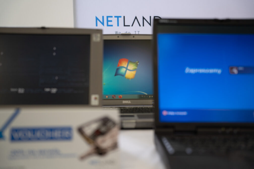 Na naszym stoisku zaprezentowaliśmy również rozwój technologii na przestrzeni lat — od laptopów sprzed dwóch dekad po nowoczesne urządzenia wyposażone w system Windows 11. Była to okazja do refleksji nad tempem zmian technologicznych oraz rosnącą rolą bezpieczeństwa w środowisku cyfrowym.
